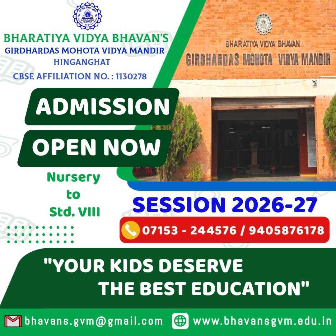 Bharatiya Vidya Bhavan’s Girdhardas Mohota Vidya Mandir , Hinganghat was launched in 2008. The day school is centrally located with ease of access from Nagpur &Wardha in Maharashtra on NH 6.